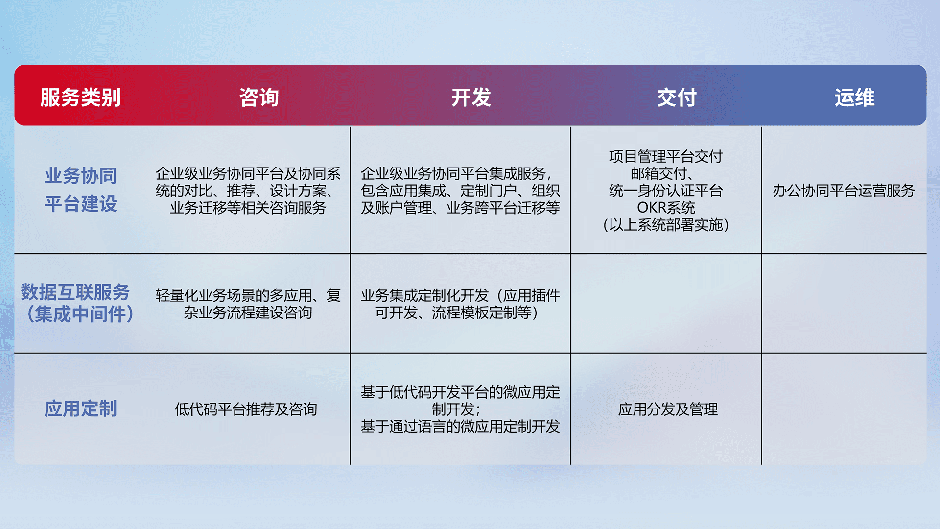 针对钉钉、、、、企微、、IDaas等平台级产品提供产品的规划、、方案、、、交付、、、、定制化开发等服务,,,实现如统一协同办公、、智能客户服务、、、混合会议管理、、智能数据查询、、等业务场景,,,,实现数字化转型。。